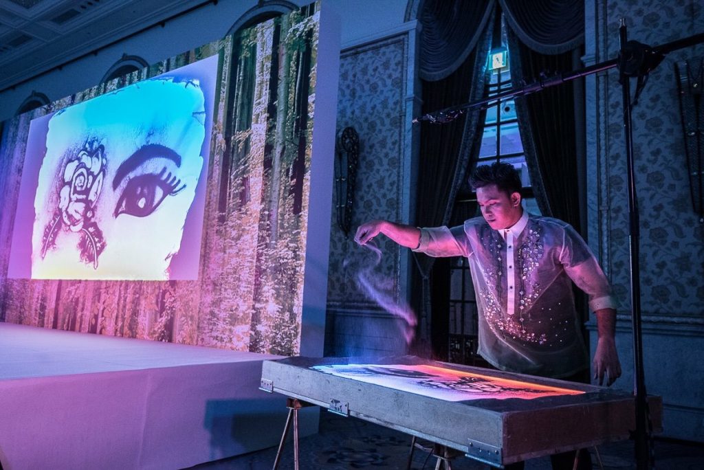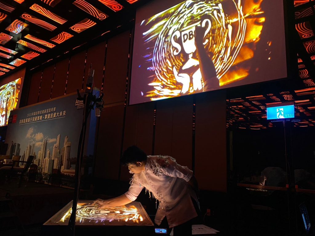透過燈光投影與現場音樂,沙畫能在舞台上呈現出具有故事性的影像演出,常被運用於企業活動、品牌發表會或紀念活動中。